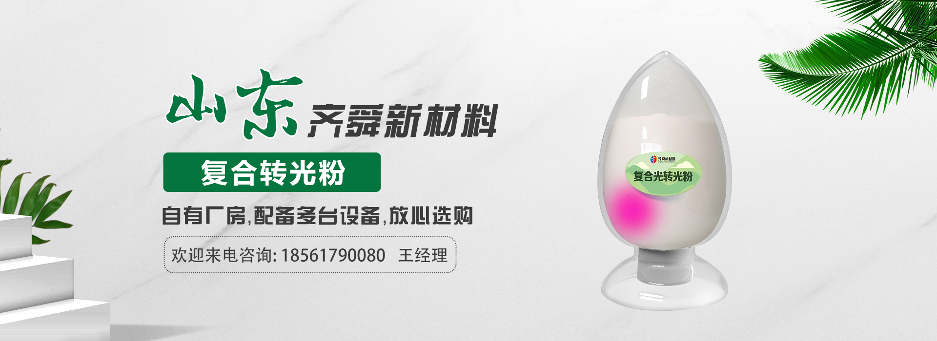 我公司前身為2011年成立的淄博舜明熒光科技有限公司。隨著公司的發展,廠址從淄博搬遷到青島,2020年5月公司重新注冊為山東齊舜新材料有限公司。公司注冊資本2000萬元,主要從事新材料研究和開發。目前主要產品包括:農膜用轉光粉、轉光母粒以及轉光農膜;農膜用長效防霧流滴涂覆液;復合肥添加劑及葉面肥(稀土微肥);防偽粉;LED封裝熒光粉;夜光粉;太陽能光伏電池增效熒光粉;鋰電池正極材料等。